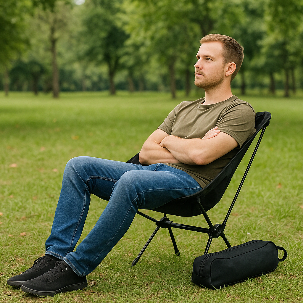 Diseñada para los amantes de la aventura, esta silla de camping combina comodidad y practicidad. Su estructura está fabricada con tubos de aluminio resistentes, lo que la hace increíblemente liviana pero estable. El asiento, de tejido sintético reforzado en color negro, se adapta al cuerpo brindando una sensación de descanso ergonómico incluso en terrenos irregulares.